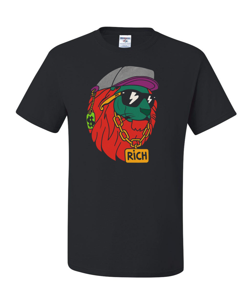 • A thick gold chain hangs around its neck with a large rectangular gold pendant that reads "RICH" in black capital letters.